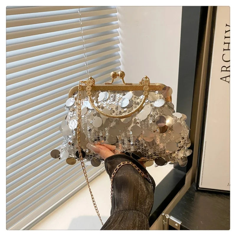 Women’s Sequin Handbag Chain Shoulder & Crossbody Clip Bag for Dinner & Party