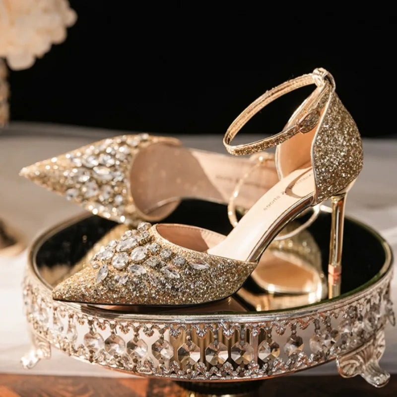Golden Crystal Ankle Strap High Heel Sandals – Elegant Wedding & Party Shoes for Women