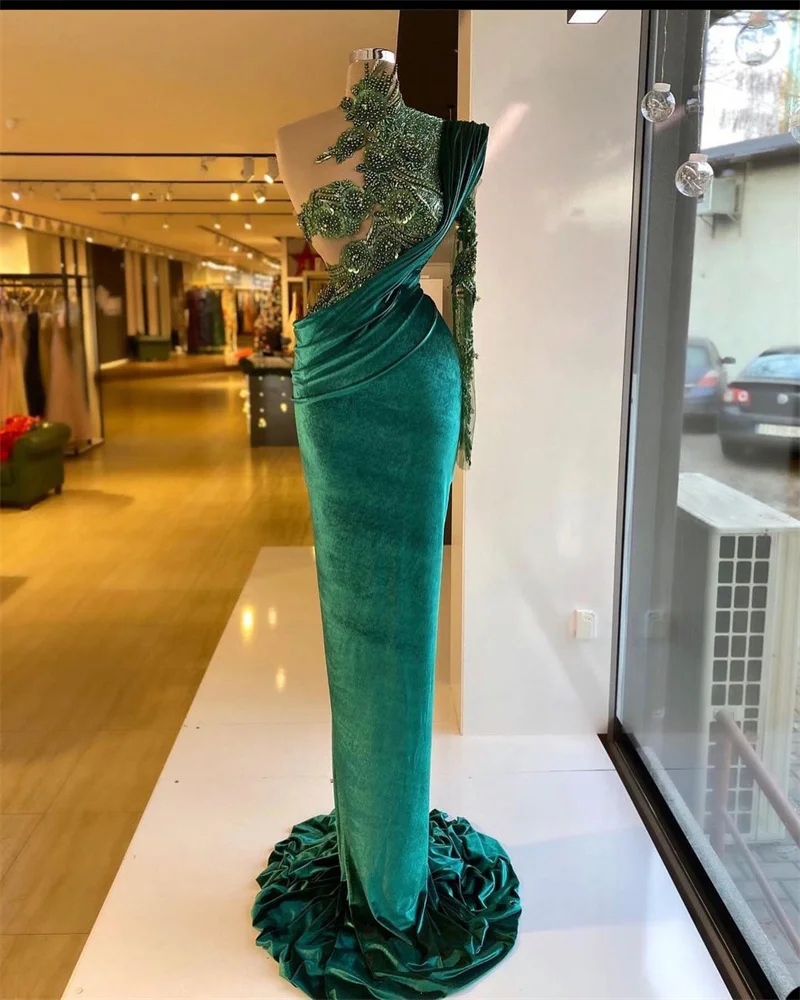 Emerald Green Mermaid Prom Dresses One Shoulder Lace Appliques Beads Flower Evening Dress Custom Made Ruffles Party Gown