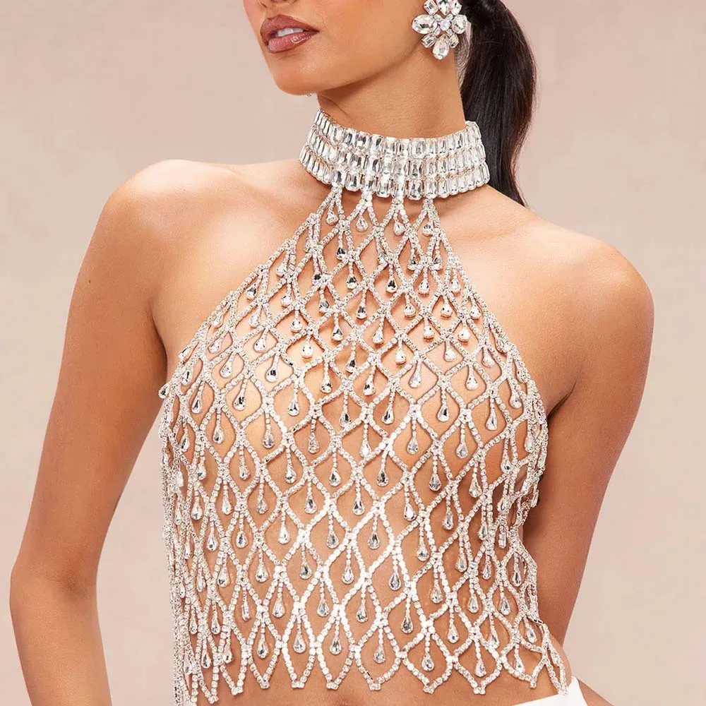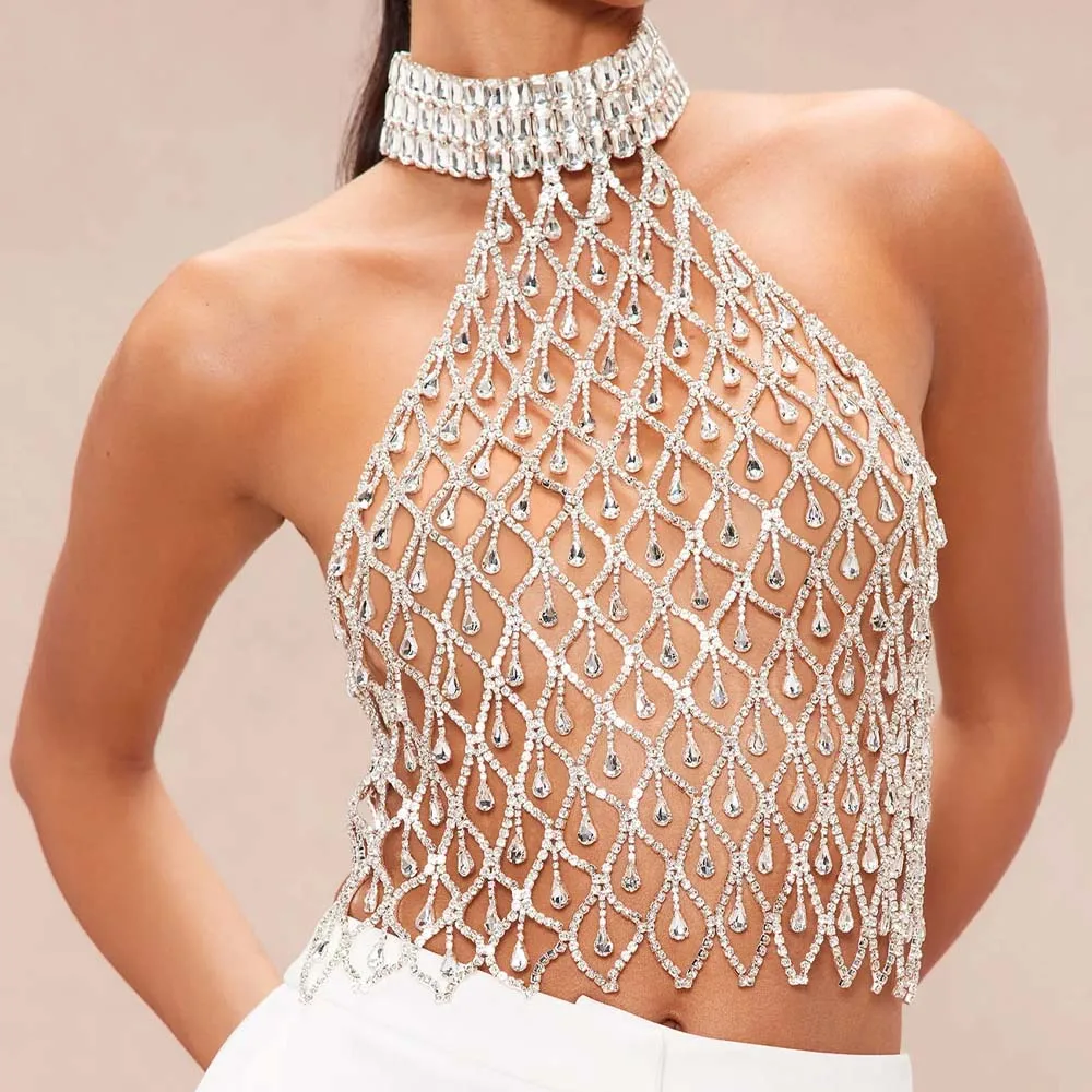 Exaggeration Mesh Chest Chain Stonefans Rhinestone Jewelry Bohemian Embellished Dance Costume Top Bra Decoration Gift