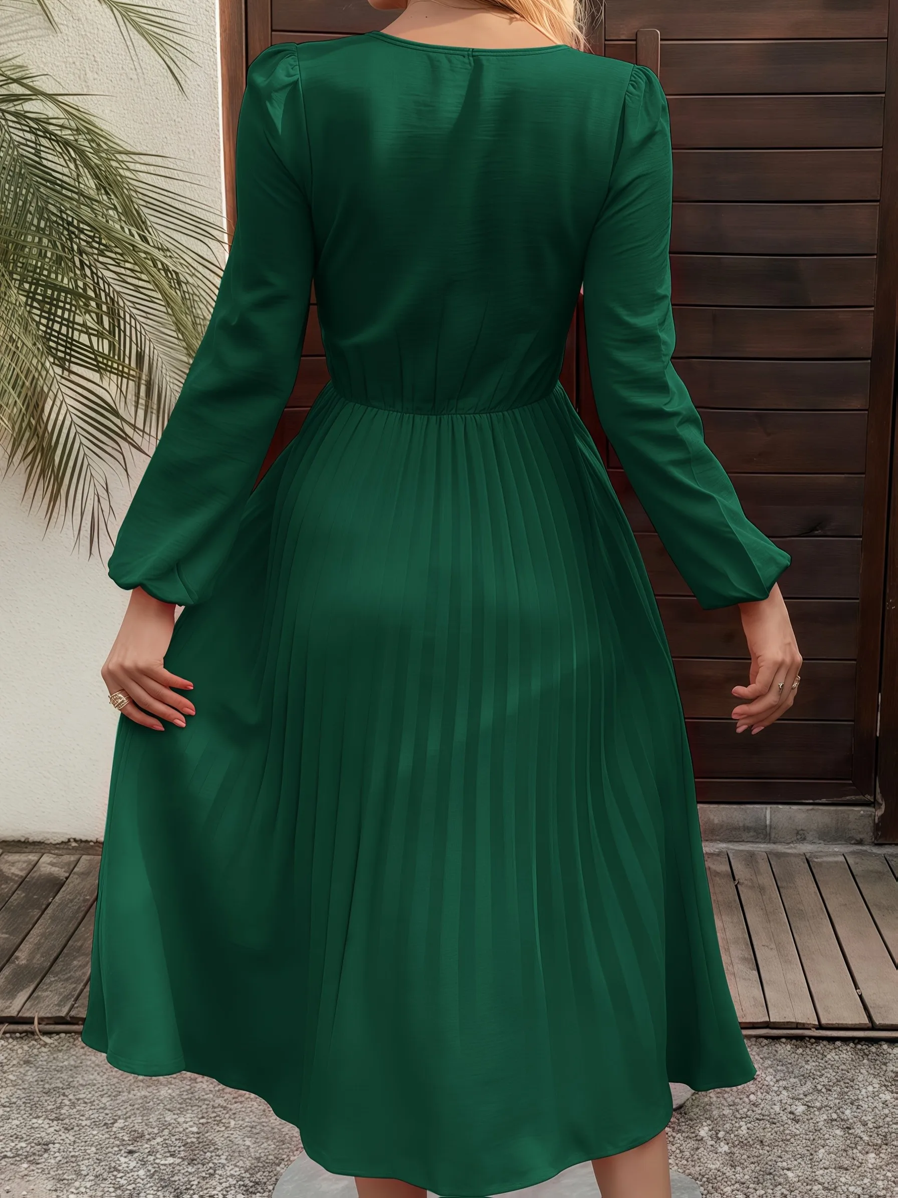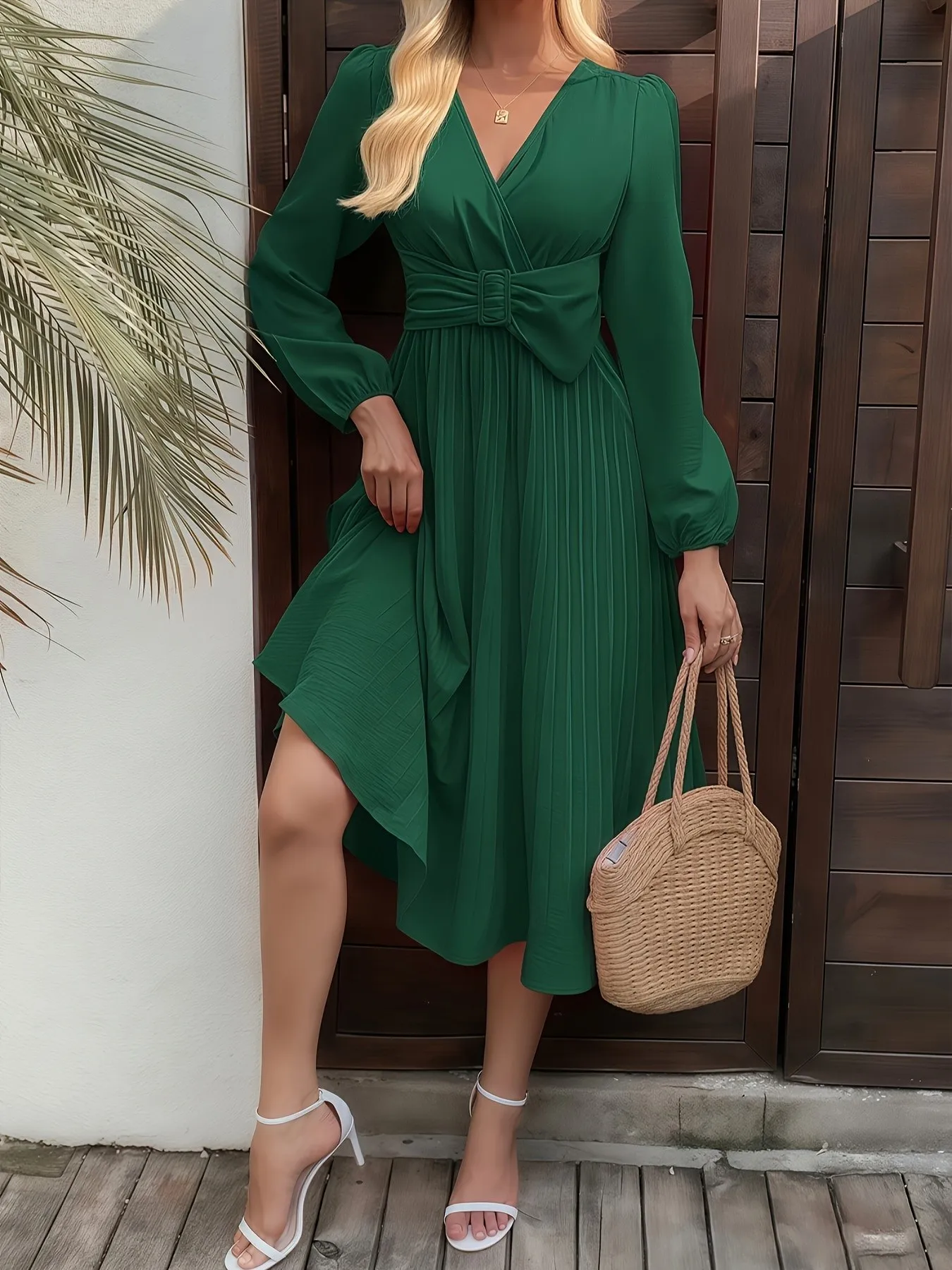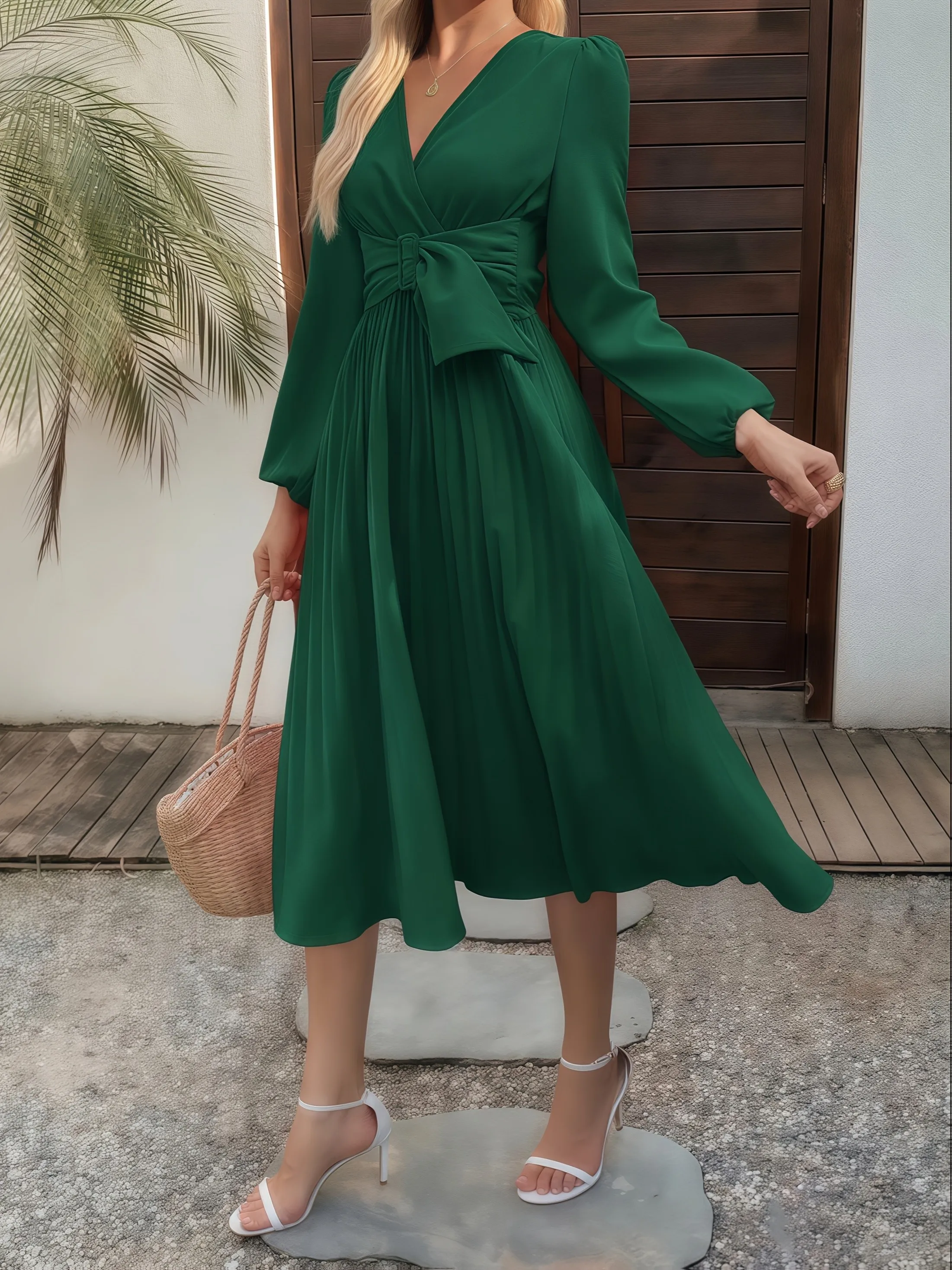 Green Chiffon V-Neck Pleated Dress – Elegant Party Fit