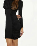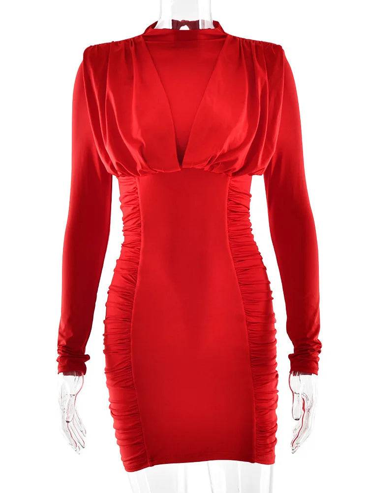 Mozision Sexy Mini Dress for Women Long Sleeve Ruched High Collar Slim Fit Club Party Gown Elegant Red above Knee Length Polyester Spandex
