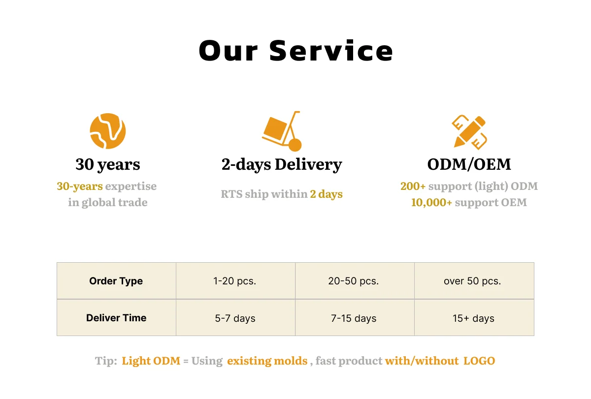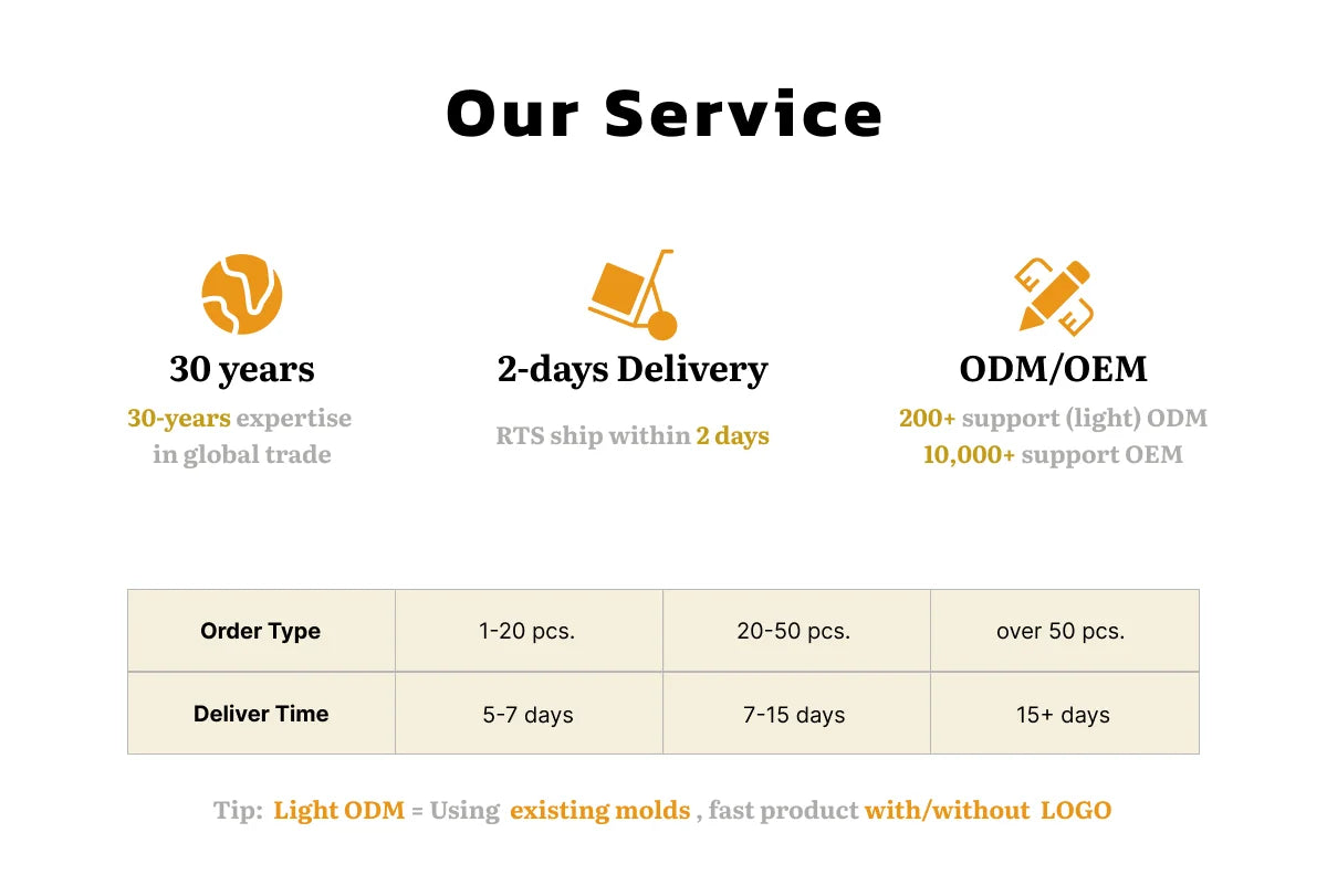 Our delivery time for RTS order is 2 to 15 days. Our delivery time for (light) ODM order is usually more than 15 days.