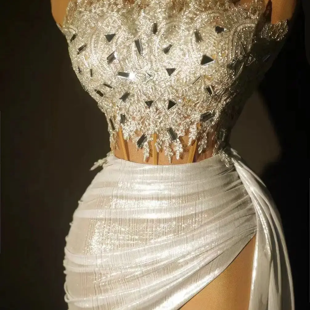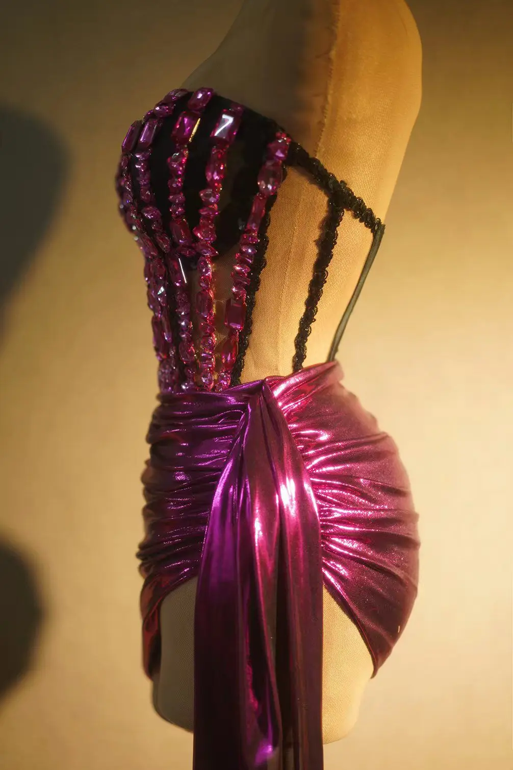 Green Silver Rhinestone Fringe Spandex Short Dress Birthday Celebrate Prom Party Show Wear Women Dancer Show Club Dress