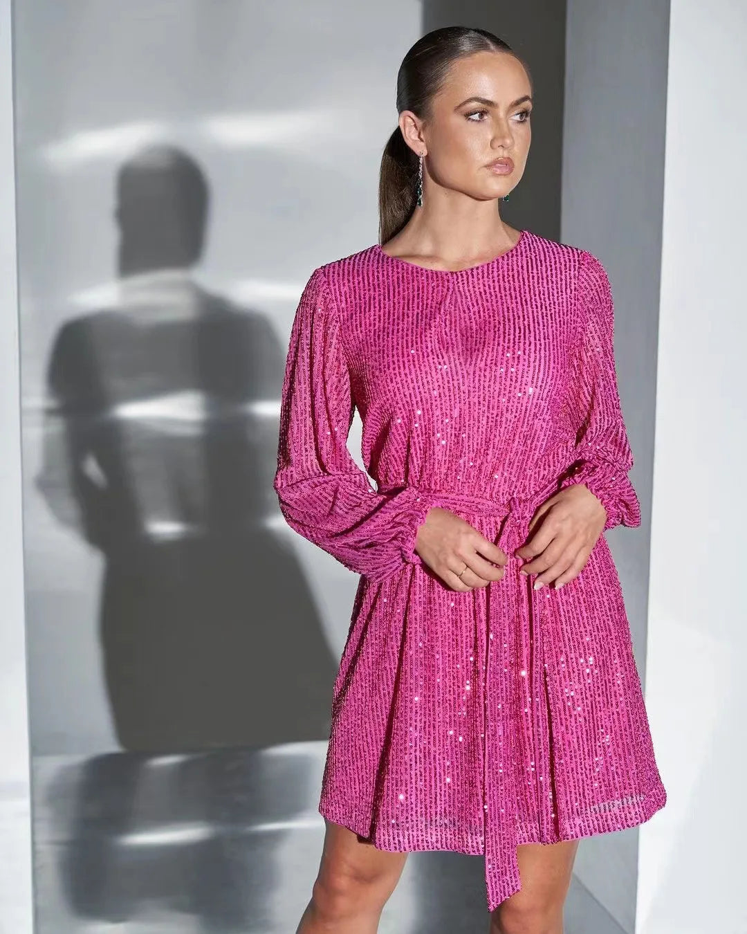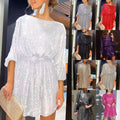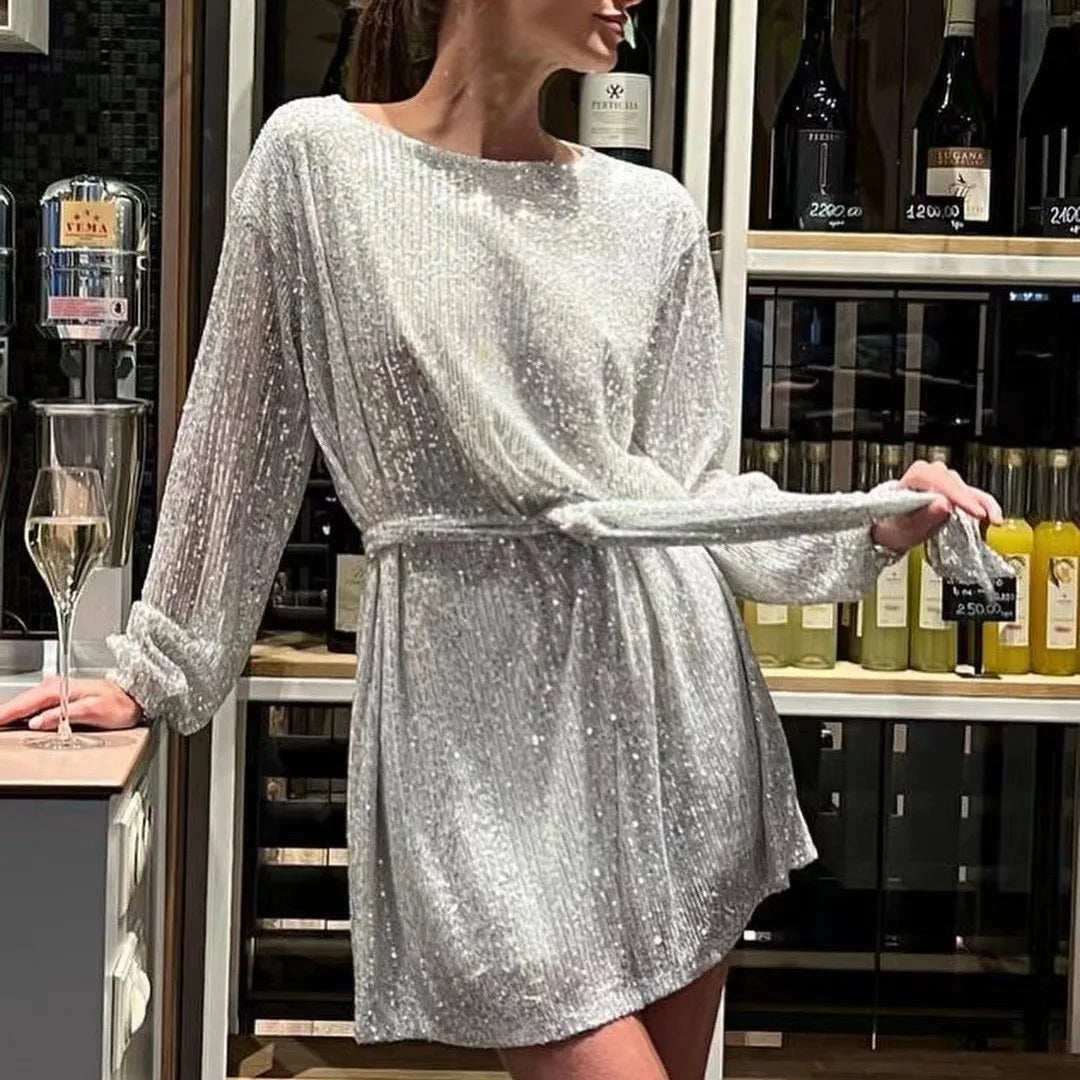 Spring/Summer Women's Elegant Party Dress Sequin Puffed Sleeves Lace-Up Waist above Knee Length Fashion Casual Robe