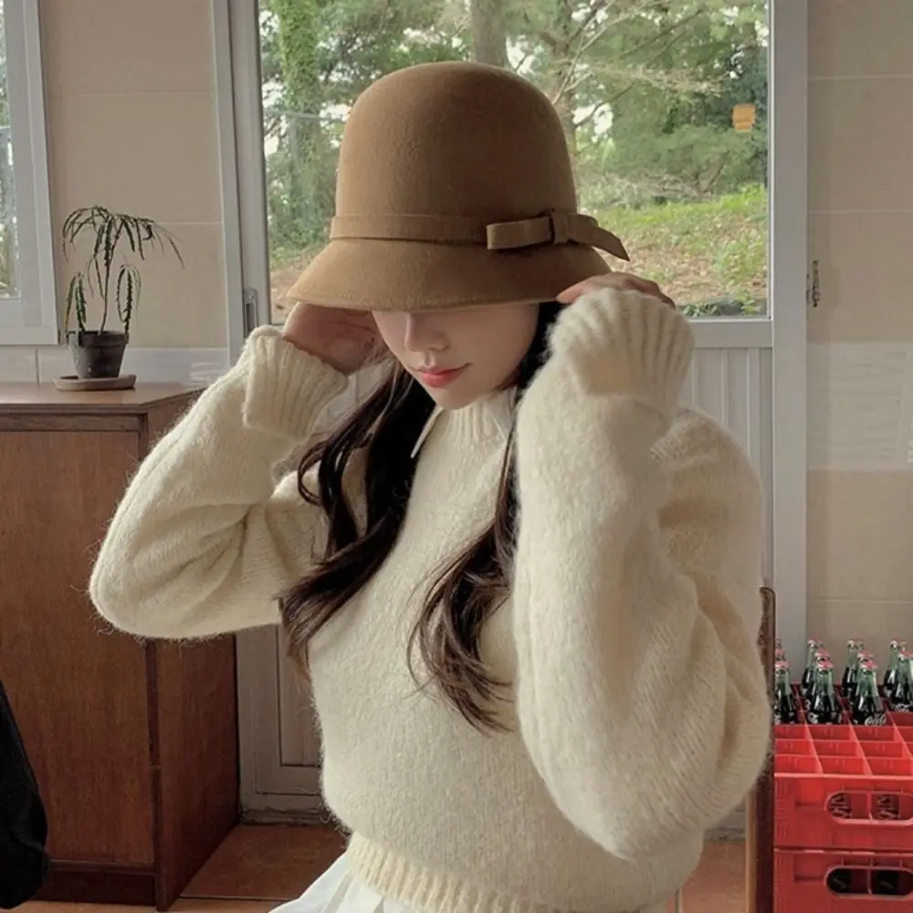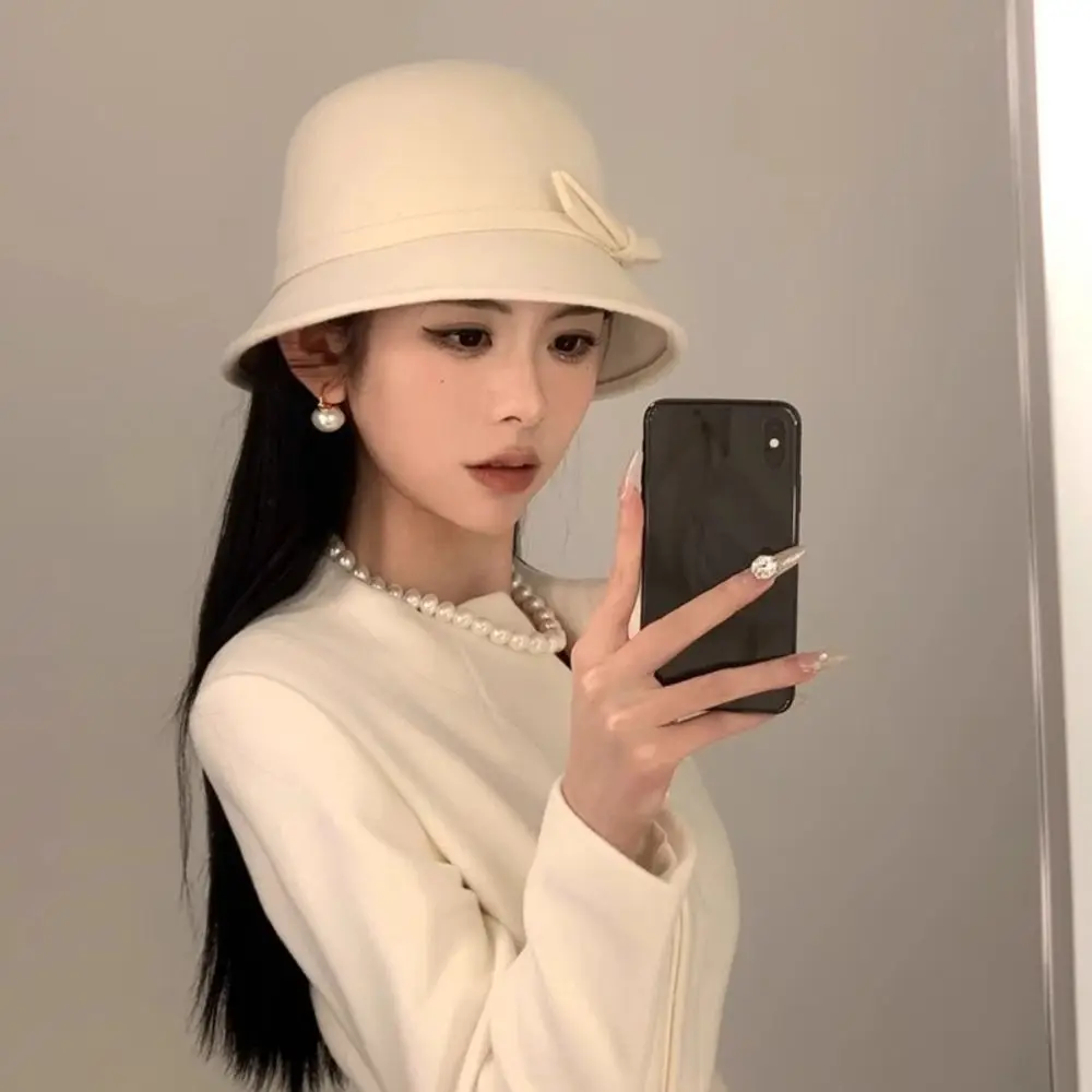 Women’s Retro Hepburn Felt Bucket Hat – Elegant British Style Bowknot Panama Cap for Autumn
