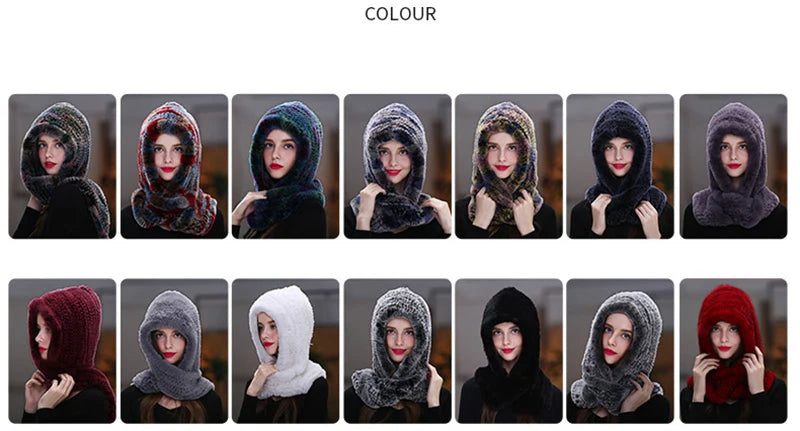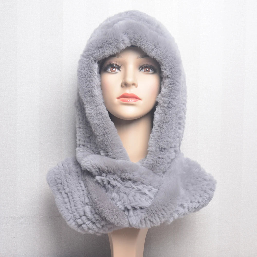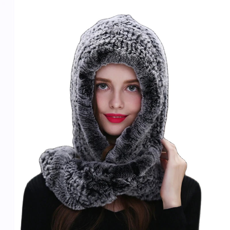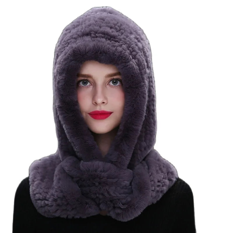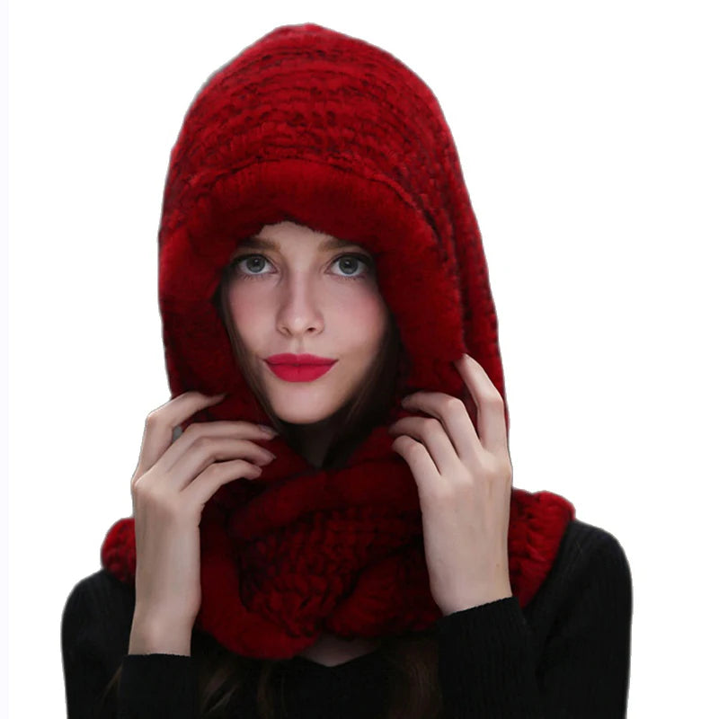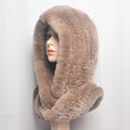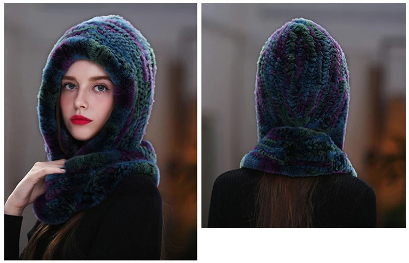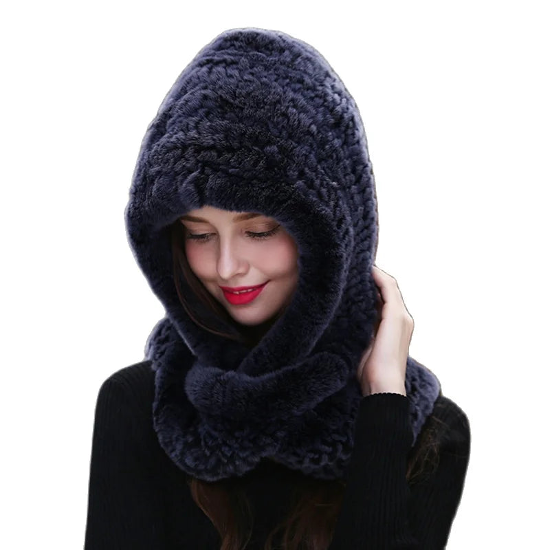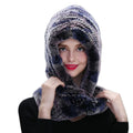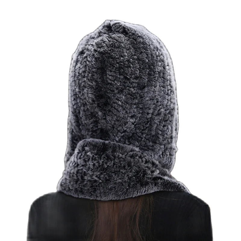 Women’s Winter Fur Hat with Hooded Scarf – Knitted Rex Rabbit Fur Bonnet for Warmth