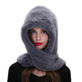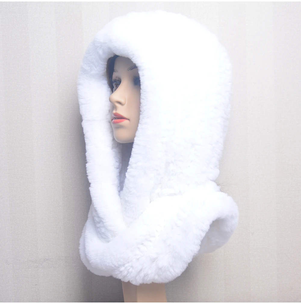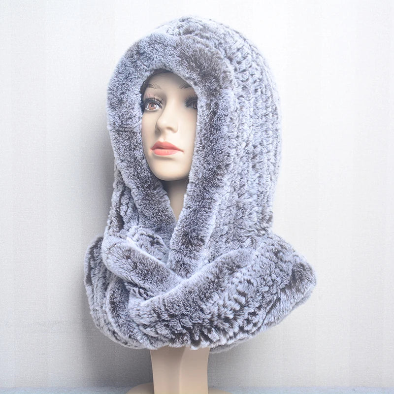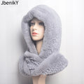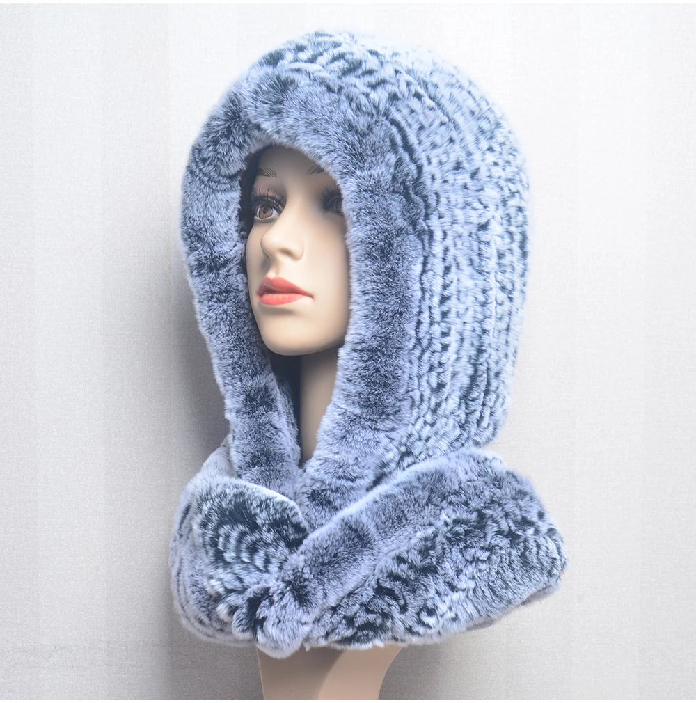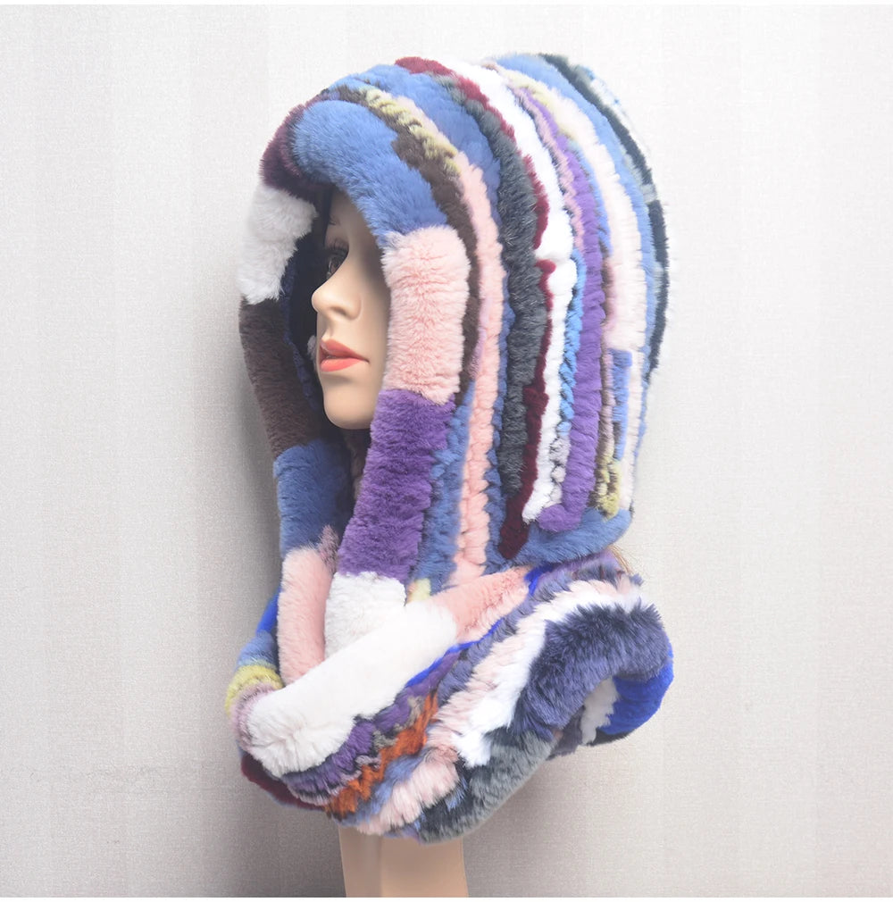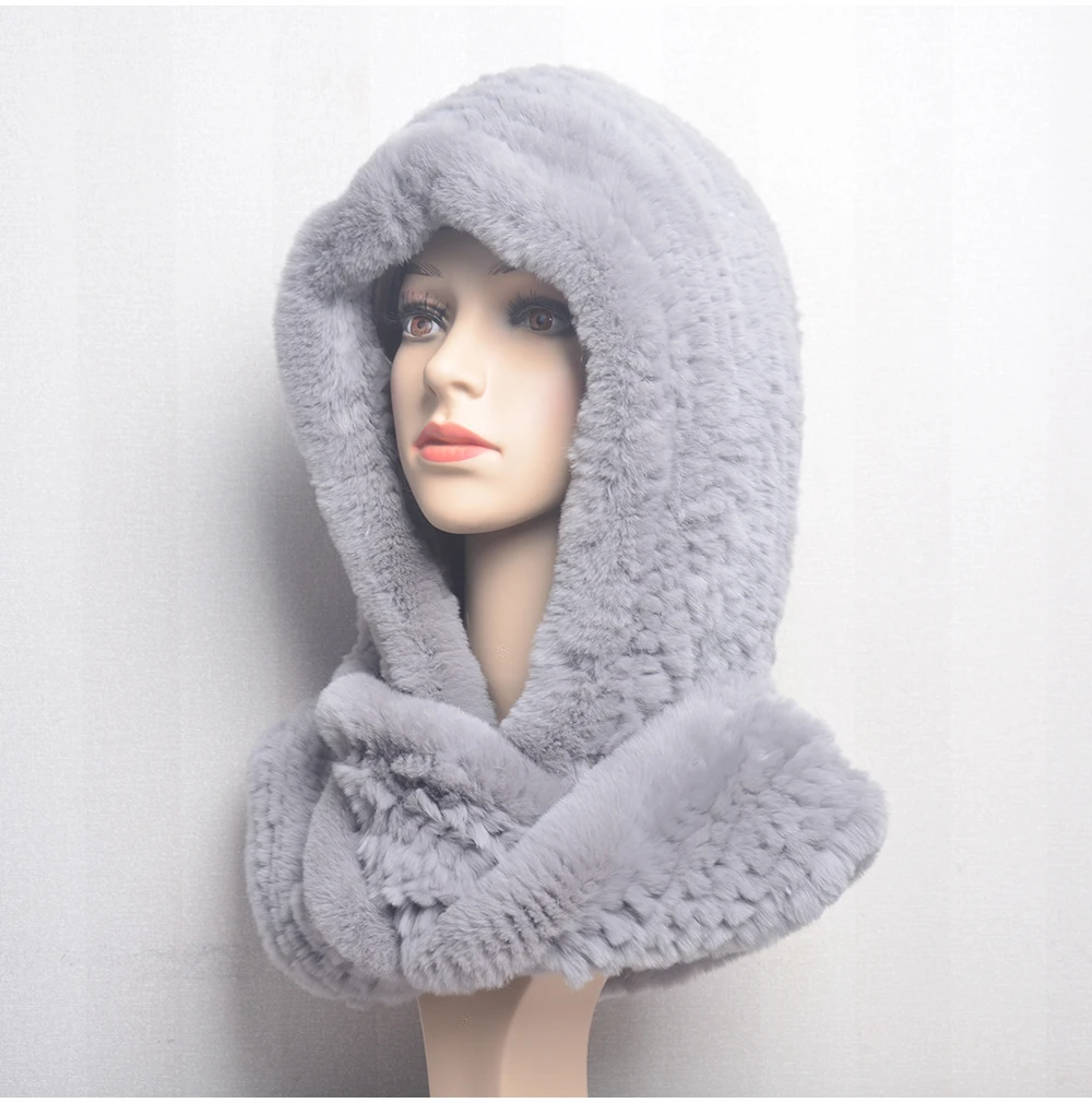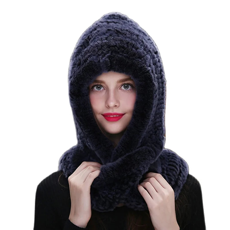 Women’s Winter Fur Hat with Hooded Scarf – Knitted Rex Rabbit Fur Bonnet for Warmth