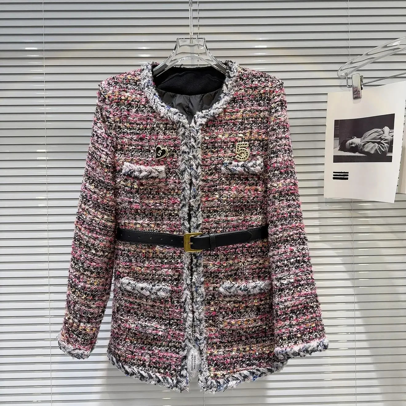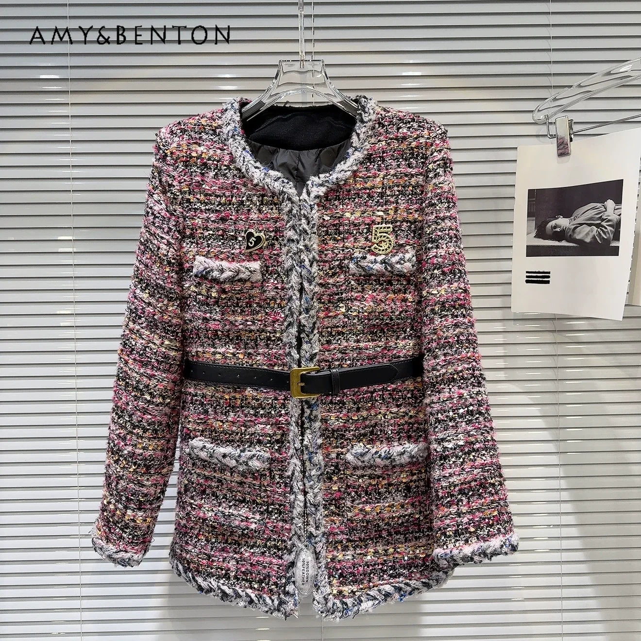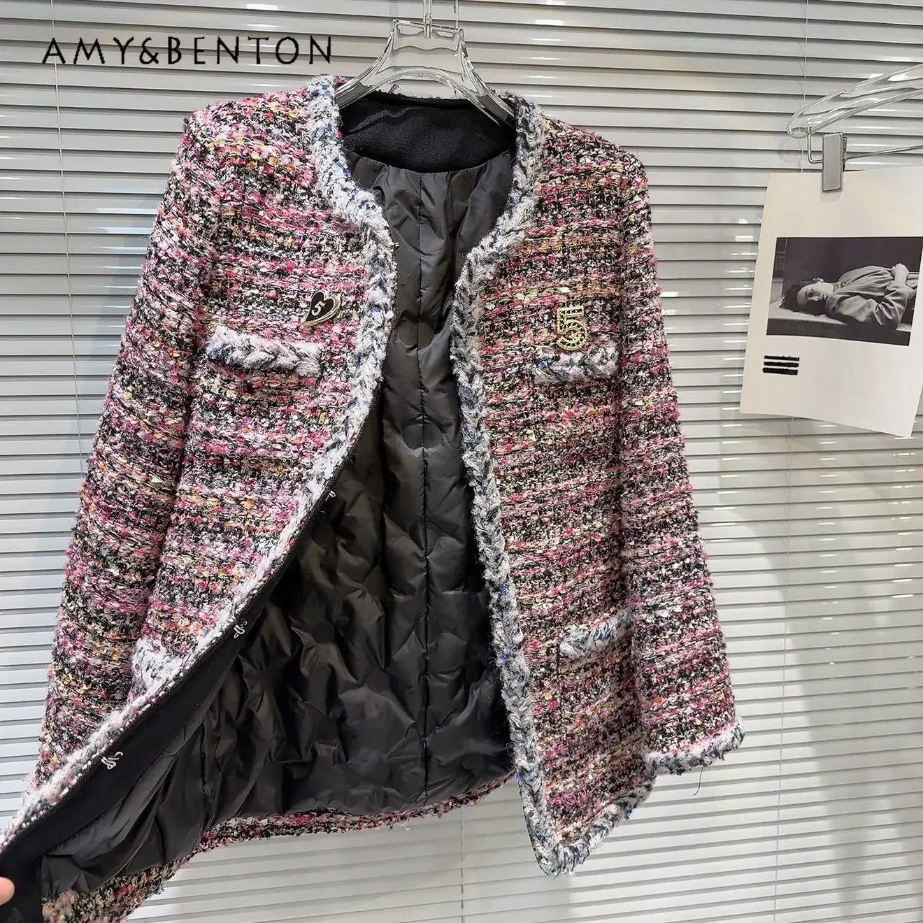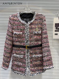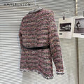 Women’s Winter Tweed Down Jacket – French Style Belted Patchwork Mid-Length Slim Coat