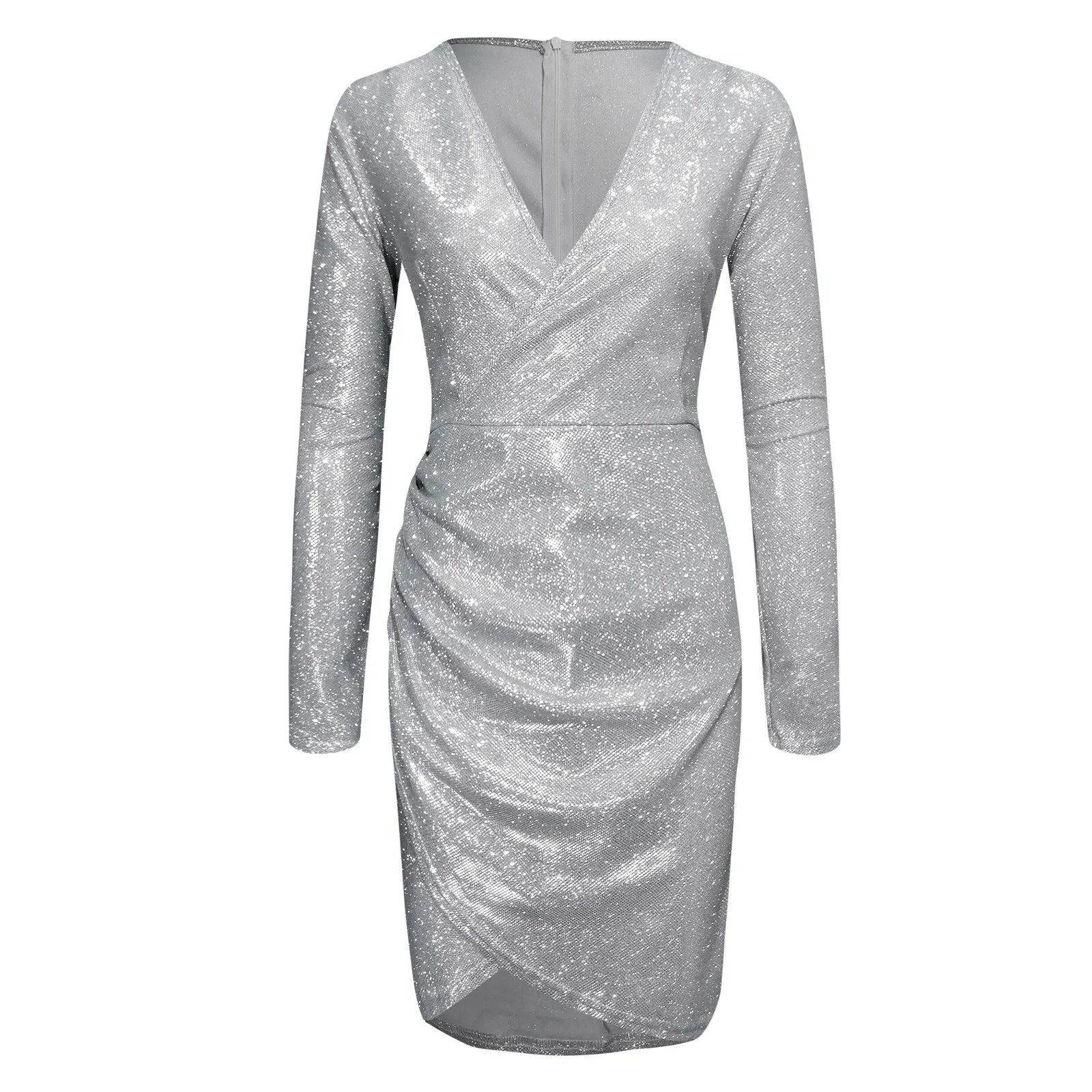 Women Sexy Sequins V-neck Long Sleeve Self Cultivation Dresses Slim Elegant Ladies Party Dress